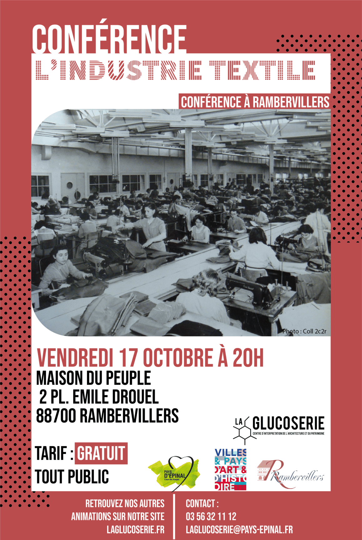 Du 17 au 22 octobre, la Ville de Rambervillers mettra à l’honneur son patrimoine textile à travers une série de animations et rencontres gratuites. Le point fort de la semaine sera la conférence-projection “L’industrie textile” de ce vendredi 17 octobre, animée par Romaric Duchêne, responsable du Pays d’art et d’histoire du Pays d’Épinal, en présence de M. Kempf, ancien directeur de l’usine Kempf.