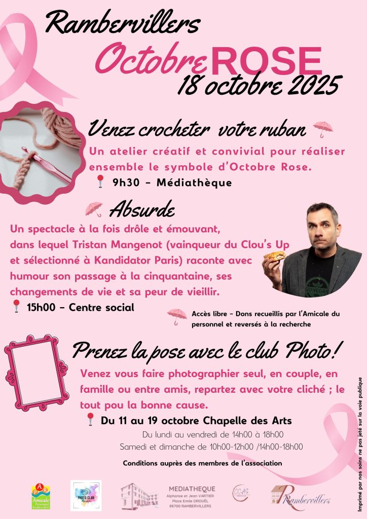 La matinée débutera à la Médiathèque avec l’atelier « Venez crocheter votre ruban », un moment créatif et convivial autour du symbole d’Octobre Rose. L’après-midi, le Centre social accueillera le One Man Show de Tristan Mangenot – “Absurde”, un spectacle drôle et émouvant dans lequel l’artiste évoque avec humour les grandes étapes de sa vie et sa vision du temps qui passe. Les dons collectés seront intégralement reversés à la recherche contre le cancer du sein.