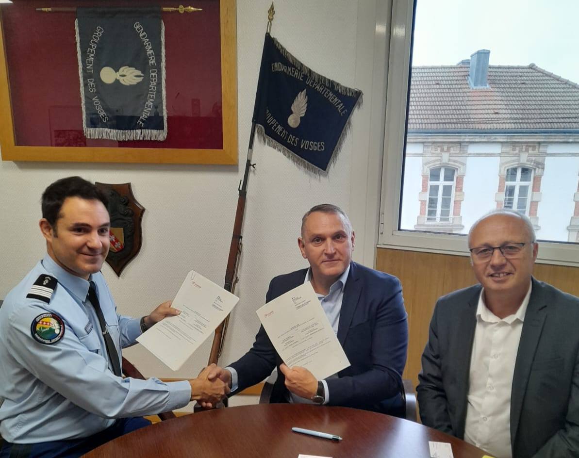 Ce matin, la gendarmerie des Vosges et la société Transdev ont officialisé leur collaboration à travers la signature d’une convention de partenariat. Le colonel Moura, commandant la gendarmerie des Vosges, et M. Marani, directeur Vosges – Meurthe-et-Moselle Sud de Transdev, étaient réunis pour sceller cet accord qui vise à renforcer la sécurité des transports de personnes dans le département.