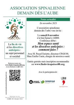 l’association spinalienne Demain dès l’aube a le plaisir d’organiser une conférence-débat sur le thème « Mon Espace Santé et les directives anticipées : comment faire ? » le samedi 8 novembre 2025, à 14h, à la Bibliothèque Multimédia Intercommunale (BMI) d’Épinal.