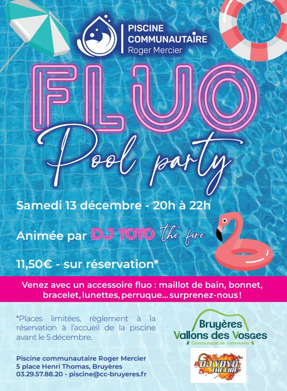 Dans le cadre de ses actions en faveur du dynamisme local et de la convivialité, la Communauté de Communes Bruyères Vallons des Vosges propose une soirée exceptionnelle à la piscine communautaire Roger Mercier à Bruyères : la Fluo Pool Party, le samedi 13 décembre 2025, de 20h à 22h.Cette soirée inédite alliera détente, musique et ambiance lumineuse autour du thème du fluo.