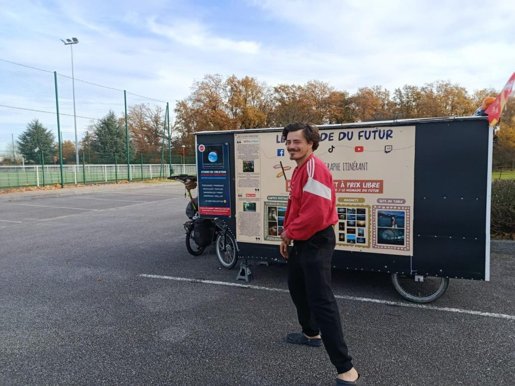 Sa maison ? Une minuscule roulotte qu’il a entièrement conçue et aménagée lui-même, tractée par son vélo couché. Véritable cocon sur roues, elle lui sert à la fois d’abri, d’atelier et de bureau.
