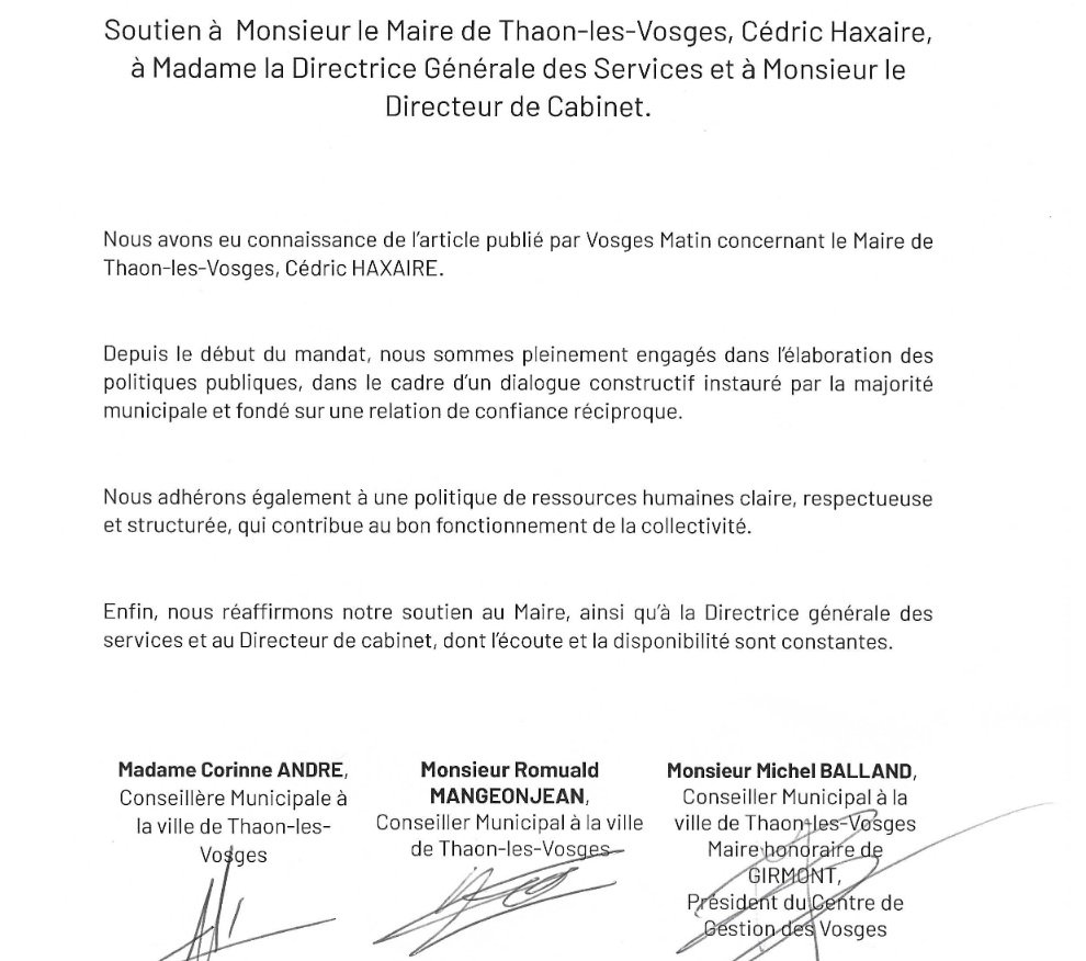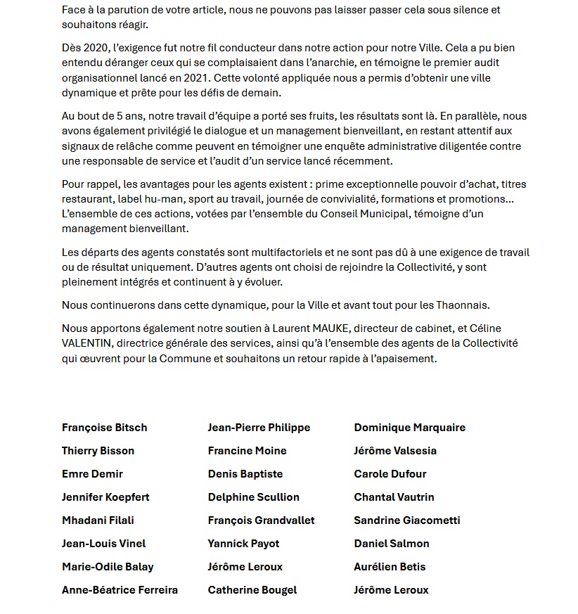 Enfin, les conseillers municipaux ont tenu à exprimer leur soutien à Laurent Mauke, directeur de cabinet, et à Céline Valentin, directrice générale des services, ainsi qu’à l’ensemble des agents municipaux. Ils appellent à un retour rapide à un climat apaisé, affirmant leur volonté de poursuivre leur action « pour la Ville et avant tout pour les Thaonnais ».