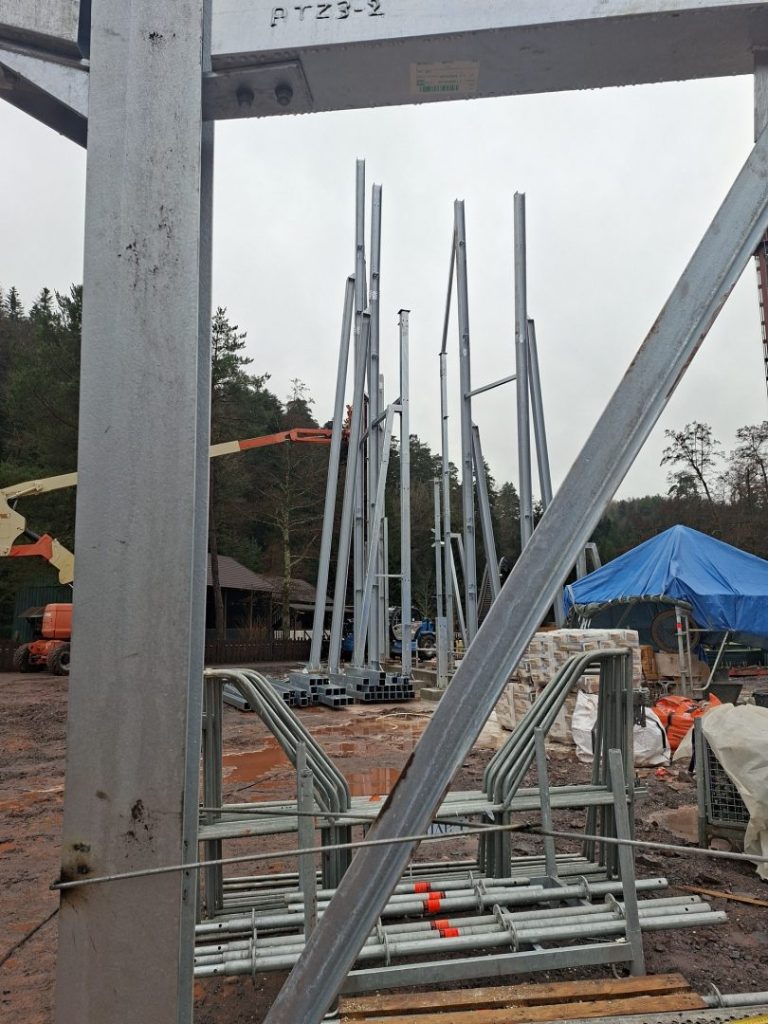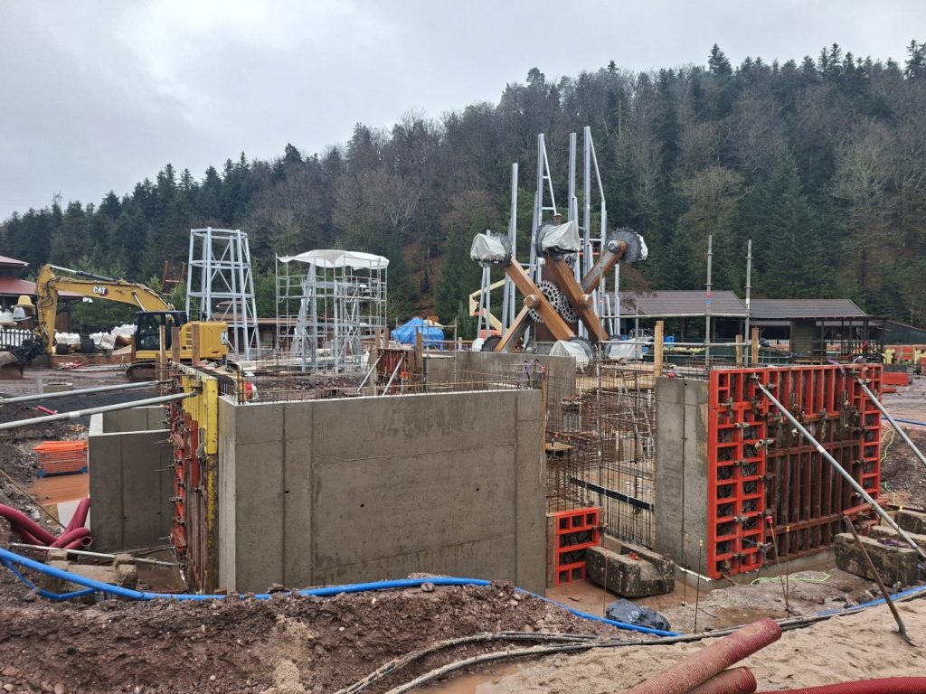 Les fondations de la gare de Fireline Redwood, le futur coaster, sont désormais bien visibles… et ce n’est que le début ! Les premières structures émergent du sol et laissent entrevoir l’ampleur du projet. D’impressionnantes ossatures métalliques, destinées à soutenir les décors monumentaux, prennent actuellement forme grâce au savoir-faire de l’entreprise française MPS Montage.