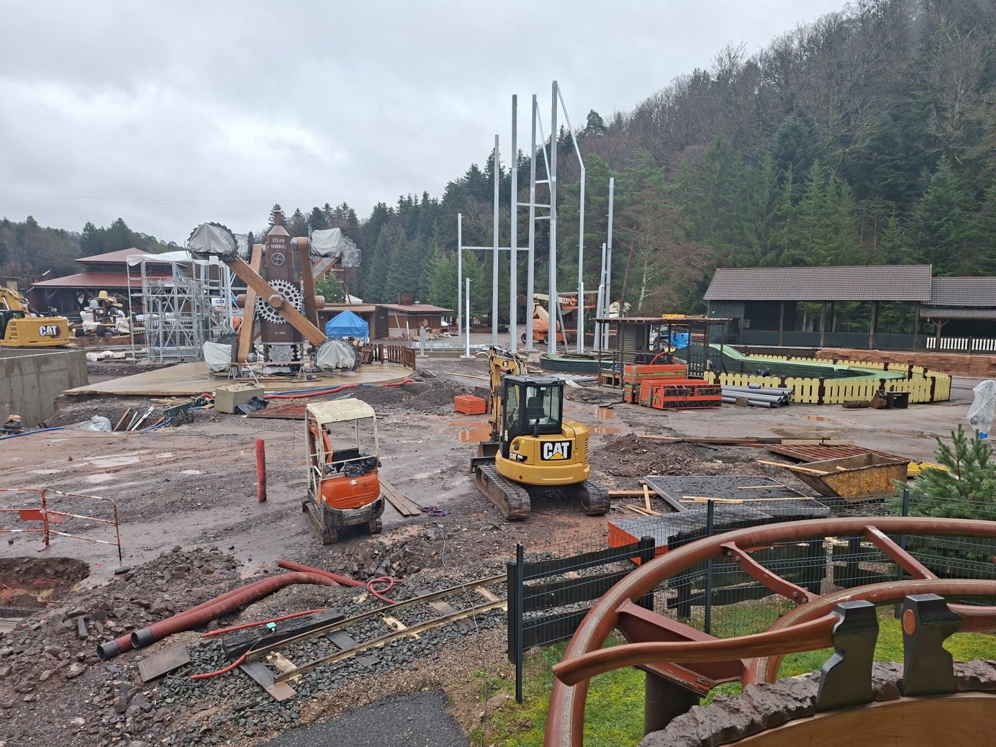 Les fondations de la gare de Fireline Redwood, le futur coaster, sont désormais bien visibles… et ce n’est que le début ! Les premières structures émergent du sol et laissent entrevoir l’ampleur du projet. D’impressionnantes ossatures métalliques, destinées à soutenir les décors monumentaux, prennent actuellement forme grâce au savoir-faire de l’entreprise française MPS Montage.