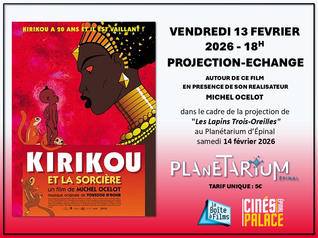 Les Cinés PALACE EPINAL, en partenariat avec le Planétarium d’Epinal et la MJC Belle étoile, proposent une projection de Kirikou et la sorcière en présence de Michel OCELOT (réalisateur) ce vendredi 13 février à 18h.
