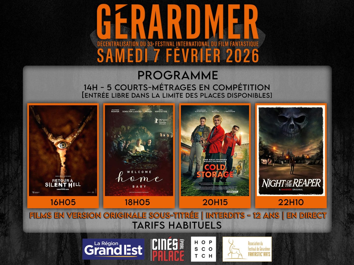 Les Cinés Palace Epinal, en collaboration avec l’association du festival de Gérardmer « Fantastic’arts », la Région Grand Est et la société Hopscotch, proposent pour la première fois une journée de décentralisation du festival international du film fantastique de Gérardmer aux Cinés Palace Epinal le samedi 7 février 2025.