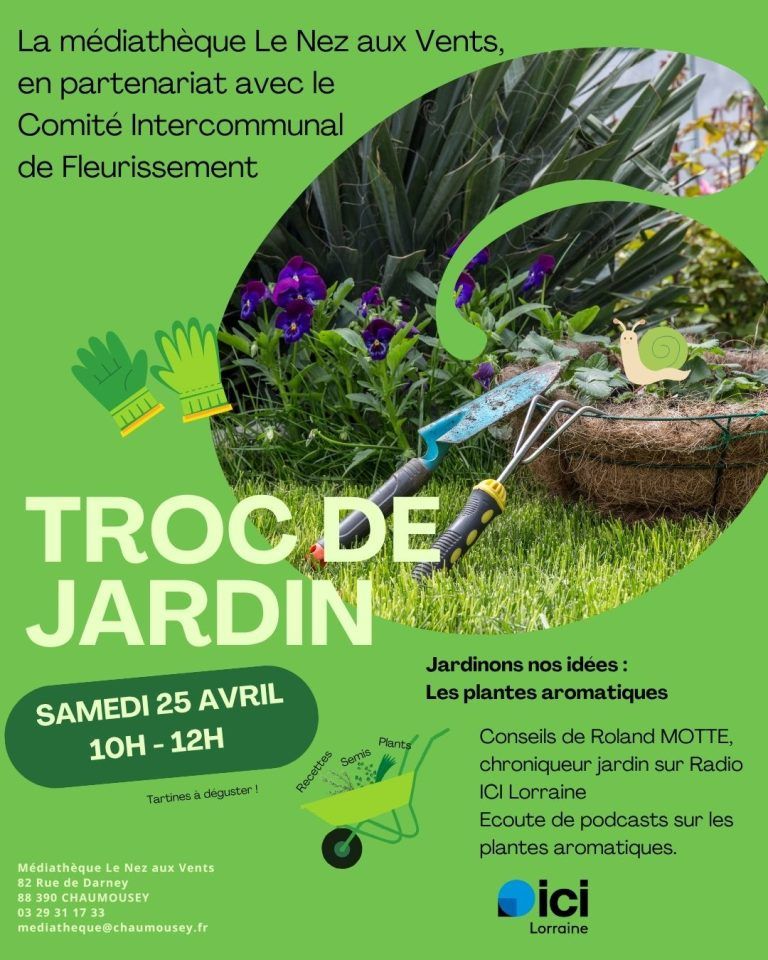 Amateurs de jardinage, passionnés de plantes et curieux de nature, cet événement est fait pour vous ! La médiathèque Le Nez aux Vents, en partenariat avec le Comité intercommunal de Fleurissement, organise un Troc de jardin dédié aux herbes aromatiques.