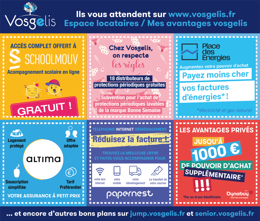 Payer 300 € par an de moins sur ses abonnements, bénéficier de protections périodiques gratuites, gagner jusqu’à 1000 € par an sur ses achats quotidiens… sans oublier l’aide aux devoirs en ligne offerte aux enfants : ce sont les « avantages Vosgelis » et il ne faut pas hésiter à en profiter !