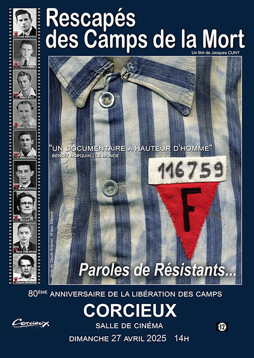 Dans le cadre du 80e anniversaire de la Libération des camps nazis, la Mairie de Corcieux organise une projection du film-documentaire de Jacques Cuny, « Paroles de Résistants… Rescapés des camps de la mort », ce dimanche 27 avril à 14h au cinéma de la commune. Entrée libre, en sachant que le DVD pourra être acheté le jour de la projection.