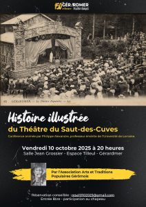Dans le cadre des 150 ans de l’Office de Tourisme de Gérardmer, une conférence sur le théâtre du Saut des Cuves est proposée par Alain Grivel, en partenariat avec l’association Arts et Traditions Populaires Gérômois. Elle sera animée par l’historien Philippe Alexandre, professeur émérite de l’Université de Lorraine.