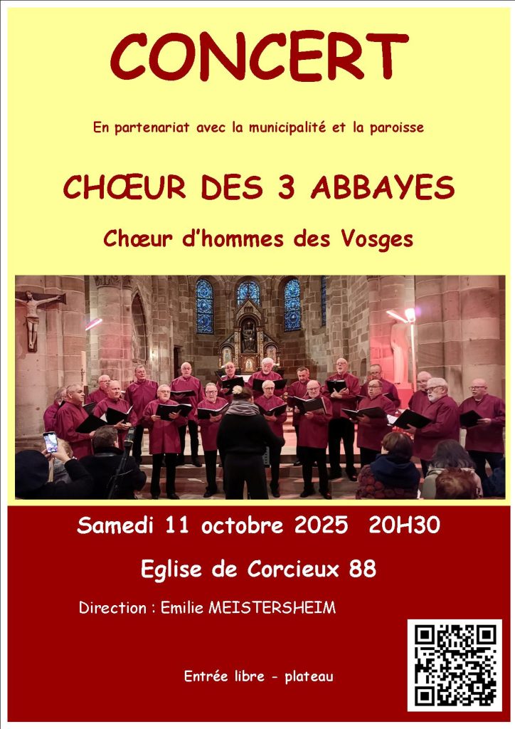 Le Chœur des 3 Abbayes, formation vocale composée d’un chœur d’hommes des Vosges, se produira le samedi 11 octobre à 20 h 30 en l’église de Corcieux.