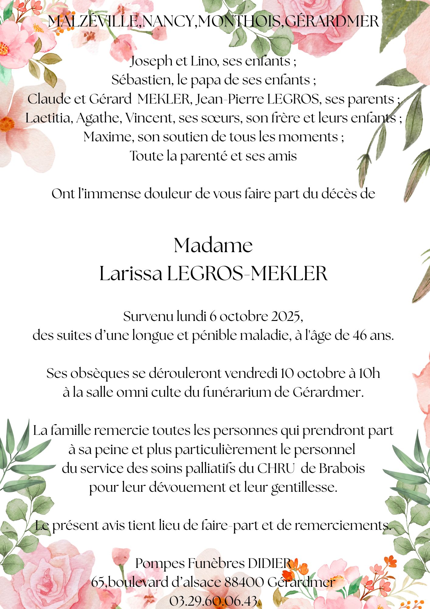 Décès de Madame Larissa LEGROS MEKLER