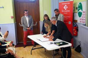 Après un propos introductif de Frédéric Thomas, Maire de Granges-Aumontzey qui souligne « le choix de ce lieu qui nous tient à cœur et qui sera mis à l’honneur aujourd’hui », le Président du Parc, Laurent Seguin a pris la parole. Il a insisté dans son allocution sur l’importance au sein de cette instance de « se mettre autour de la table, au-delà des limites administratives et dogmatiques. » Le sénateur Jean Hingray a également souligné l’importance de l’initiative, là où Jérôme Mathieu – conseiller départemental et Président de la chambre d’agriculture – a confirmé le souhait du Conseil Départemental des Vosges à continuer à travailler aux côtés du Parc, afin que ses habitants, « ceux qui y vivent et ceux qui y travaillent se trouvent bien chez nous ». David Valence, représentant de la région Grand Est, a quant à lui insisté sur la mission de protection patrimoniale d’un Parc. Il a expliqué chercher à inscrire la chapelle Notre-Dame-du-Saint-Rosaire au titre des monuments historiques, dans le cadre de sa présidence à la commission régionale du patrimoine et de l’architecture. Il a également précisé sa vision qui est de fédérer, intervenir avec humilité dans ses actions et innover. Il prend pour exemple la mise en place de la navette des crêtes, gérée désormais par la région Grand Est, mais imaginée initialement par le PNRBV. À sa suite, Antoine Planquette sous-préfet de l’arrondissement de Saint-Dié-des-Vosges enchérira sur « l’outil extraordinaire qu’est le Parc, qui fait vivre une démocratie locale, fédère ses acteurs. » Il précisera que l’État intervient en appui au développement économique du territoire et sur le volet de l’éducation, dans l‘objectif de transmettre des connaissances aux générations futures. Selon lui, un Parc a cette capacité à « expérimenter et innover », quitte à prendre « des risques » et à réfléchir à la possibilité de « dérogations de l’autorité préfectorale ».