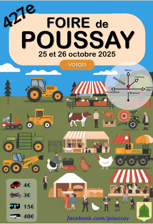 Née en 1598, la foire agricole de Poussay est la troisième plus grande foire de France ! Cette foire, dont l’entrée est gratuite –seul le parking coûte 4 euros par voiture-, attire toujours plus de visiteurs chaque année, environ 100 000 personnes en 2 jours.