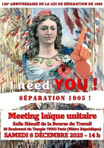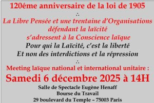 Meeting laïque national et international unitaire : Samedi 6 décembre 2025 à 14H Salle de Spectacle Eugène Henaff Bourse du Travail