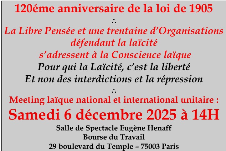 Meeting laïque national et international unitaire : Samedi 6 décembre 2025 à 14H Salle de Spectacle Eugène Henaff Bourse du Travail