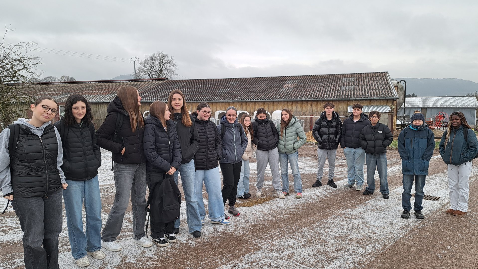 C’est par une journée bien fraîche dans le cadre de la découverte des métiers que 15 élèves de 3ème1 du collège La Haie Griselle de Gérardmer ont été accueillis au GAEC du Xavée à Corcieux par M. Florent Pentecôte et son épouse. Au-delà d’une simple visite d’exploitation c’est tout le fonctionnement d’un GAEC et l’engagement des agriculteurs locaux pour la qualité de vie des animaux et la qualité de la production qu’ont découvert les élèves. De nombreuses questions sur le quotidien, sur le métier en général et parfois des questions très poussées telles que la place que prendra l’IA dans une exploitation ont été abordées.