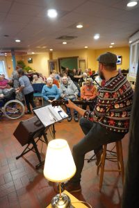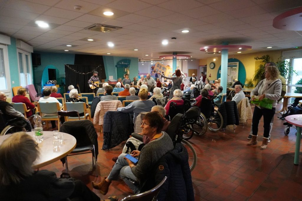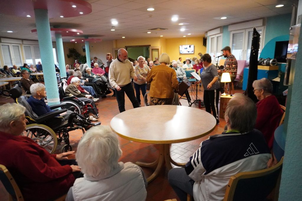 Après un apéritif composé de cochonnailles et d’un verre de la cuvée 2025 de ce nectar rouge, les résidents et invités du centre communal d’action sociale, ont profité d’un concert du soliste Florent Dupic. L’artiste, dont le cachet a été pris en charge par le CCAS, a animé la salle commune de l’Ehpad L’Accueil de la Vologne, à Granges-Aumontzey. Sur un fond noir surmonté d’une guirlande, une lampe de chevet posée sur une caisse en bois : le talentueux jeune homme a offert une prestation à la fois conviviale et intimiste. Sa familiarité avec ce public saute rapidement aux yeux. Rien d’étonnant pour cet ancien aide-soignant, habitué aux spectateurs expérimentés. À deux doigts de la musicothérapie, le guitariste a chaleureusement remercié son public, et plus particulièrement l’animatrice-coordinatrice, Marion Kieffer-Rys, qui semble y être pour beaucoup dans l’énergie dégagée dans la salle commune. Le goûter s’est une fois de plus terminé par la dégustation d’un gâteau, confectionné par les cuisiniers de l’Ehpad.