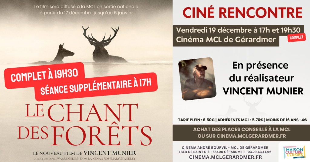 Pour fêter le début des vacances de Noël, la MCL de Gérardmer a le plaisir d’accueillir le réalisateur et photographe Vincent Munier pour une séance supplémentaire de son nouveau film Le chant des forêts !