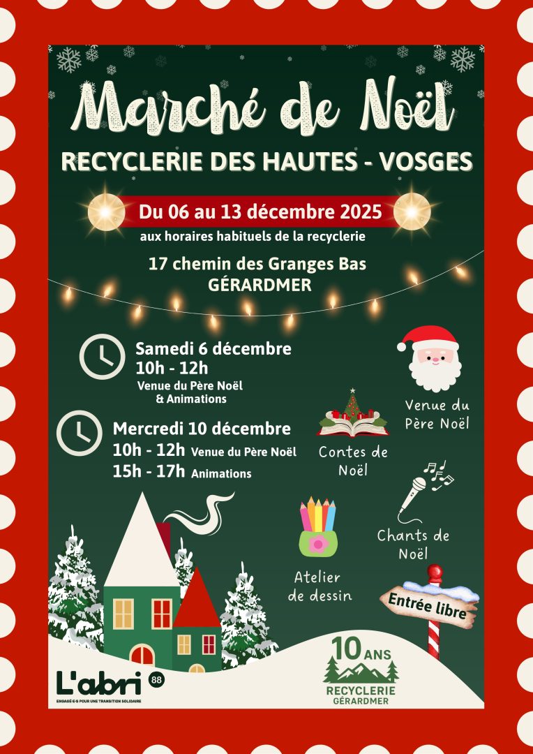 L’association L’Abri est heureuse d’annoncer la tenue du Marché de Noël solidaire à la Recyclerie des Hautes-Vosges à Gérardmer.