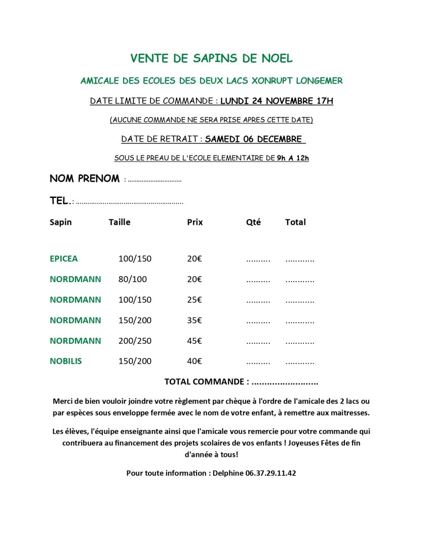 Alors offrez vous un Noël magique avec un sapin de qualité et une bonne action pour les enfants informations xonruptamicaleparents@yahoo.fr.- Rien de plus simple remplir le bon de réservation et le déposer à la mairie avec votre règlement. La livraison aura lieu le samedi 6 Décembre matin à l’école de Xonrupt Longemer.
