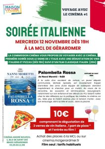 La commission cinéma de la MCL vous propose cette première soirée de voyage avec le cinéma sous le signe de l’Italie avec une dégustation de vins italiens et pizzas (dès 19h) suivi d’un film classique italien (à 20h).