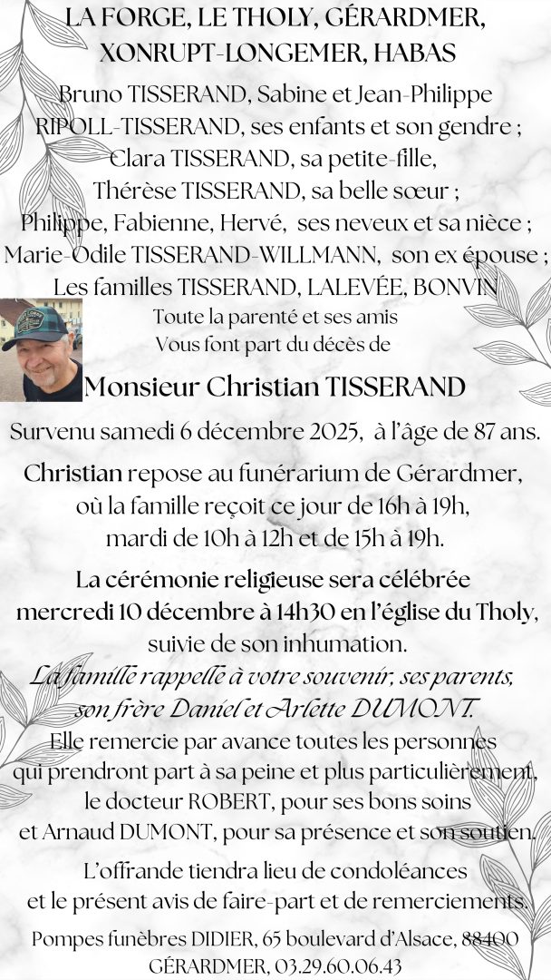 8 décembre 2025 | A la une | Avis de décès | Gérardmer | Gerardmer | Xonrupt-Longemer