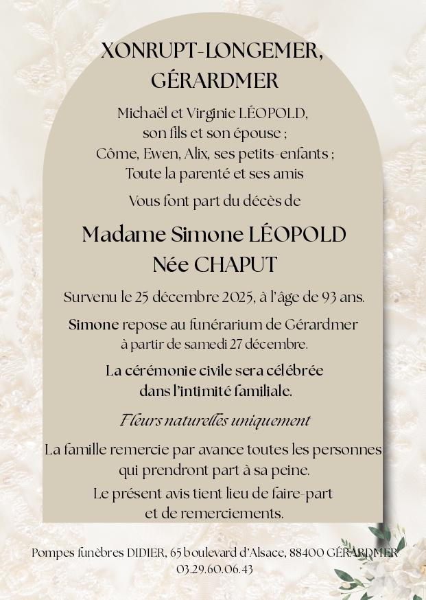 Décès Madame Simone LÉOPOLD Née CHAPUT |