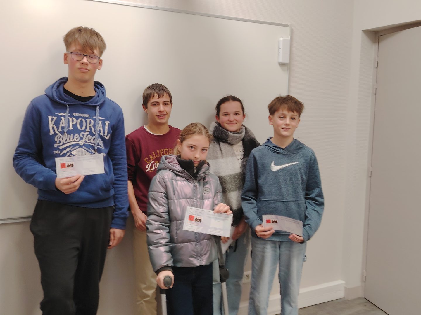 Les lauréats par niveau sont : Olivier Madika en 6e avec 72,5 points, Adrien Hans en 5e avec 77,5 points, Tom Rondet en 4e (absent lors de la remise), Bastien Rousel en 3e avec 70,1 points, Maëlle Mengin en seconde avec 56,25 points, Aymé Lejeune en première avec 55 points et, en terminale, Laudine Brugnard avec 57,5 points.