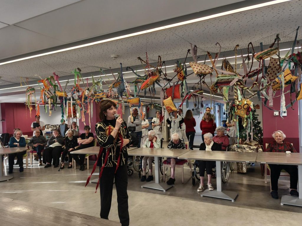 Né d’une première sensibilisation à l’art textile contemporain en 2024, comprenant visite d’exposition et ateliers créatifs, ce parcours artistique vise à réveiller les sens, stimuler les gestes et valoriser les savoir-faire. Pour orchestrer cette initiative lancée il y a environ 4 mois, l’EHPAD avait à nouveau fait appel à Jeanne Mentrel, artiste plasticienne, épaulée cette fois par Elise Py, costumière dont la mission était de trouver des solutions pratiques afin de rendre accessibles le projet et les techniques à l’ensemble des participants de l’EHPAD, mais aussi du Foyer des Essis et de l’accueil de jour.