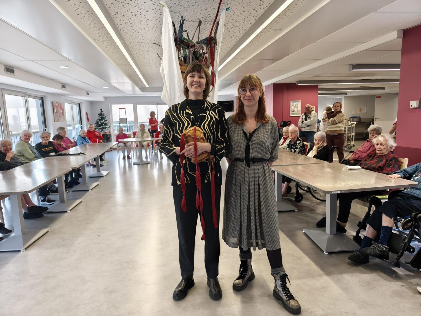 Né d’une première sensibilisation à l’art textile contemporain en 2024, comprenant visite d’exposition et ateliers créatifs, ce parcours artistique vise à réveiller les sens, stimuler les gestes et valoriser les savoir-faire. Pour orchestrer cette initiative lancée il y a environ 4 mois, l’EHPAD avait à nouveau fait appel à Jeanne Mentrel, artiste plasticienne, épaulée cette fois par Elise Py, costumière dont la mission était de trouver des solutions pratiques afin de rendre accessibles le projet et les techniques à l’ensemble des participants de l’EHPAD, mais aussi du Foyer des Essis et de l’accueil de jour.