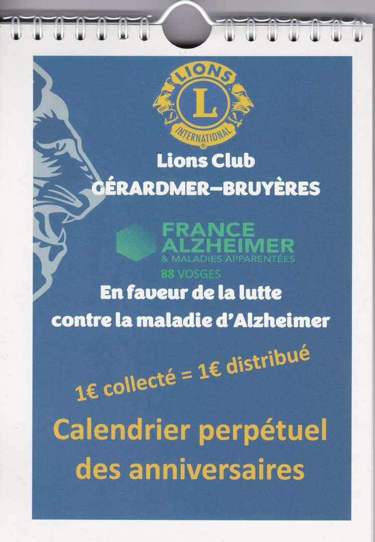 Le Lions Club Gérardmer-Bruyères propose à la vente un calendrier perpétuel à 5 € sur lequel vous inscrirez une seule fois les dates fixes : anniversaires, fêtes, dates marquantes de votre vie. Toutes ces dates seront consultables à vie. La recette de cette vente sera reversée à la fondation France Alzheimer Épinal qui assiste les malades à domicile et les aidants; tous ont besoin d’écoute, d’informations et d’orientation.