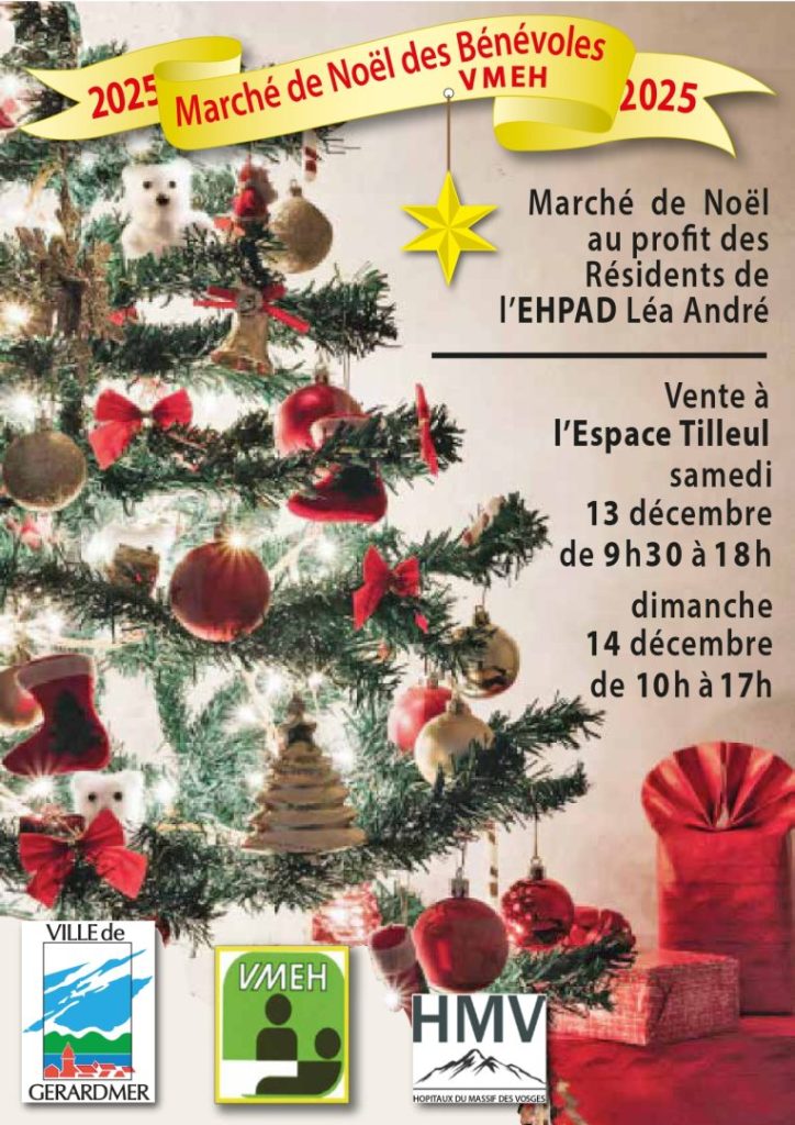 Le traditionnel Marché de Noël organisé par la VMEH au profit des résidents de l’Ehpad de Gérardmer aura lieu le samedi 13 et le dimanche 14 décembre 2025 à l’espace Tilleul :