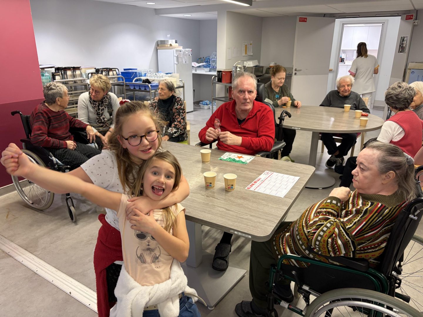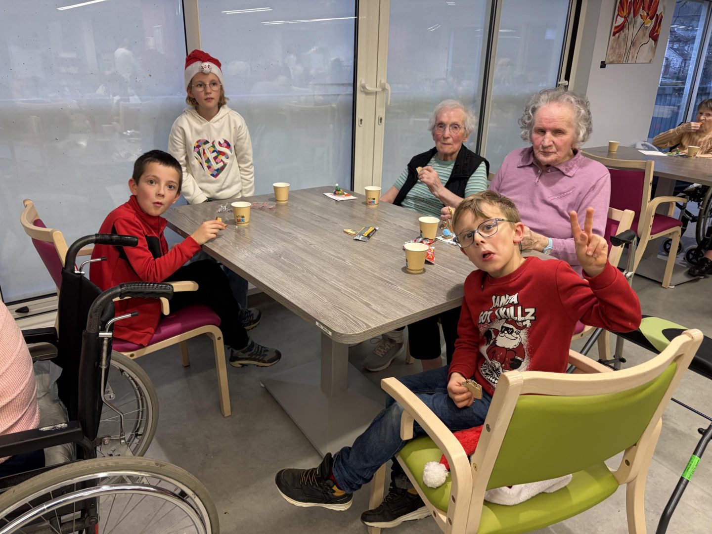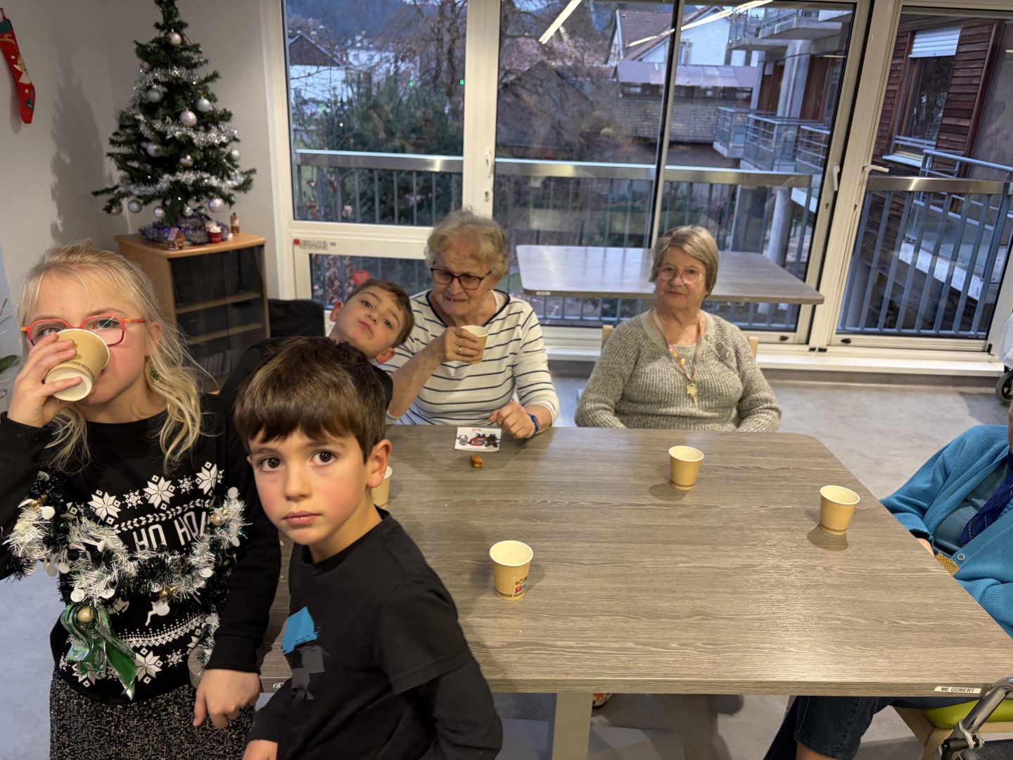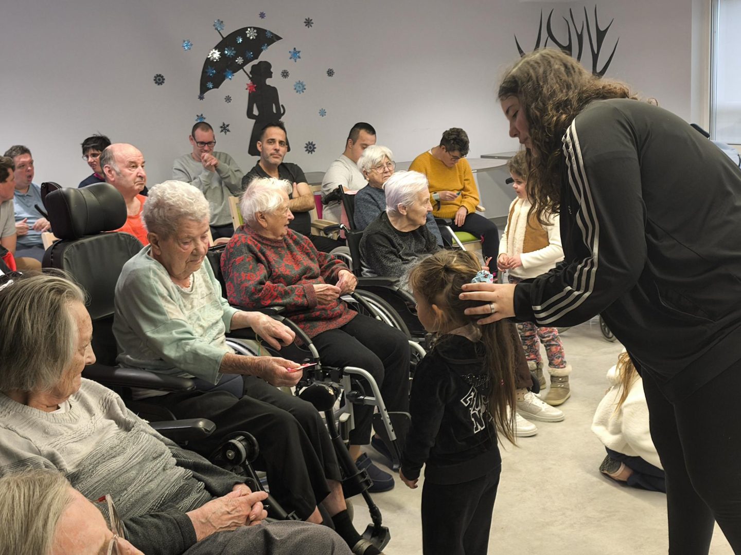Les réjouissances ont débuté par une chanson de Noël écrite avec les Ce1 – Ce2 de Valérie Didier en privilégiant des paroles qui parlent d’amour, de partage, et d’entraide. Après la partie musicales, les enfants ont également remis des petits cadeaux (bricolages de Noël) et des cartes contenant des mots chargés de bienveillance aux résidents de la MAS et de l’EHPAD. Le tout étant bien entendu confectionné par leurs soins. Ils ont ensuite laissé la place à leurs petits camarades de grande section et CP, puis à ceux de CM1 – CM2 qui ont fait de même.L’après-midi s’est poursuivie par une petite session dédiée au jeu avec les résidents Ehpad et Mas avant que tout ce petit monde ne se réunisse pour savourer un goûter offert par l’EHPAD. Un bel esprit festif et solidaire, un vrai concentré de bonnes vibrations pour cette belle initiative qui a ravi les petits et les grands !