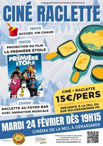 Ciné + Raclette : 15 € (hors boissons) – Préventes disponibles à la MCL ou sur le site de la MCL de Gérardmer : NOTRE SITE WEB