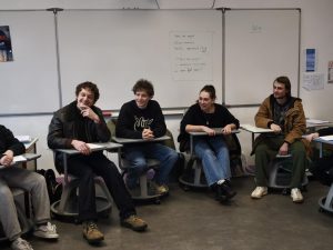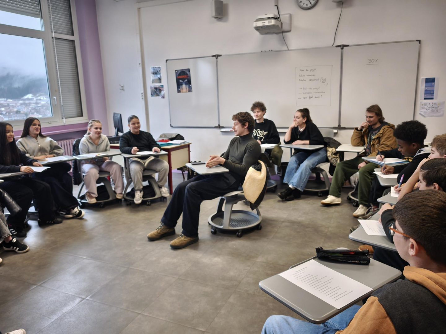 Gaspard Meier, Dimitri Fouque, Capucine Valmary et Ewen Guigon rendent visite à un groupe de collégien