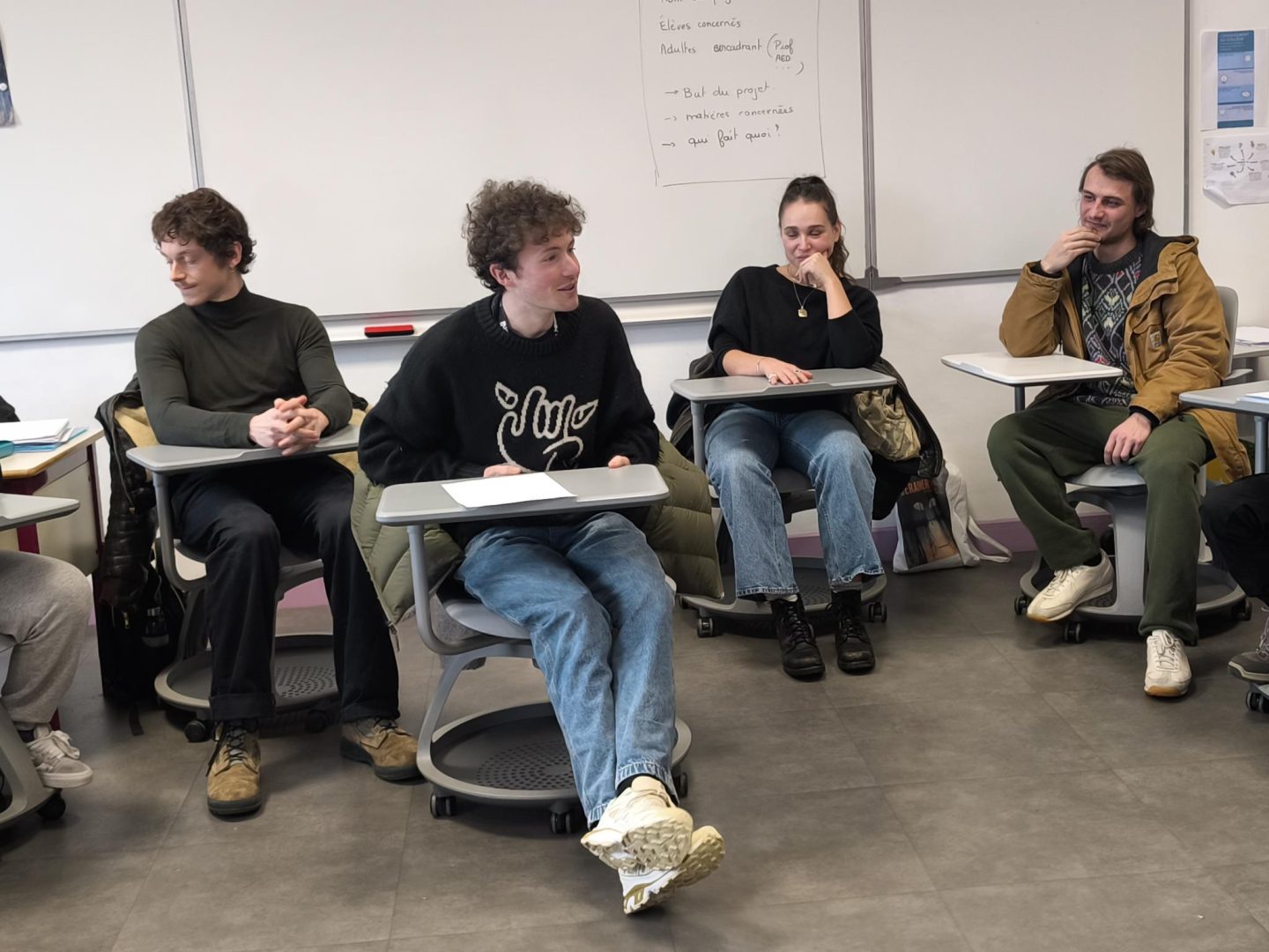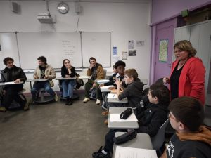 Gaspard Meier, Dimitri Fouque, Capucine Valmary et Ewen Guigon rendent visite à un groupe de collégien