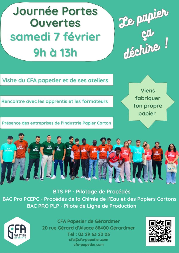 Les Portes Ouvertes du Samedi 7 février, de 9 h 00 à 13 h 00, se feront en présence d’entreprises de l’Industrie du papier-carton du Grand-Est et du territoire national. Avec le CFA Papetier de Gérardmer, l’emploi de demain se dessine dès aujourd’hui !