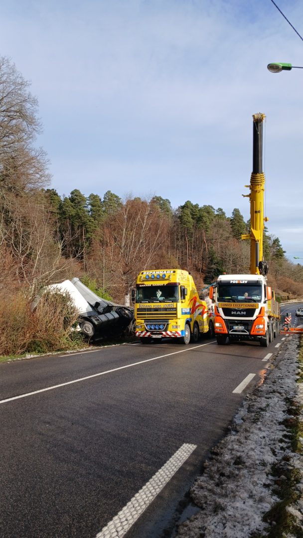 Depuis le mardi matin, un poids lourd est immobilisé, couché dans un virage, sur la départementale qui relie Jarménil à Cheniménil. Le camion est toujours sur place plusieurs heures après l’incident, gênant la circulation dans cette zone habituellement passante. La route a été fermée le temps de l’intervention.