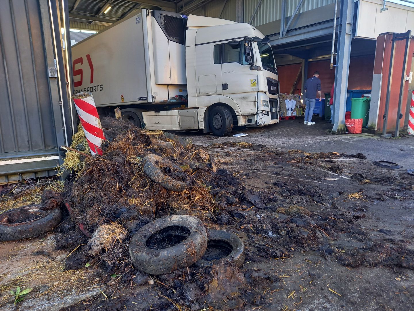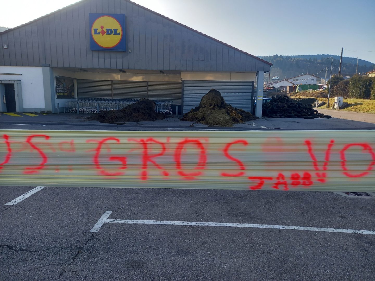 Dans la nuit de jeudi à vendredi, les agriculteurs vosgiens ont déversé des tonnes de fumier et de pneus devant l’entrée des parkings et des portes des supermarchés Super U, Intermarché et Lidl à Gérardmer.