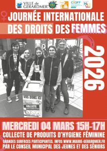 Le mercredi 4 mars, de 15h à 17h, les membres du Conseil Municipal des Jeunes et du Conseil des Séniors mèneront une collecte de produits d’hygiène féminine dans plusieurs commerces gérômois partenaires : Aldi, Intermarché, Lidl et Match. Cette action a pour objectif de sensibiliser à la précarité menstruelle et de permettre la redistribution des dons.