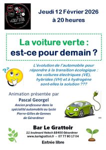 Jeudi 12 Février à 20 heures, Le Bar Le Grattoir (11 boulevard Kelsch à Gérardmer) propose une soirée sur le thème : La voiture verte : est-ce pour demain ?