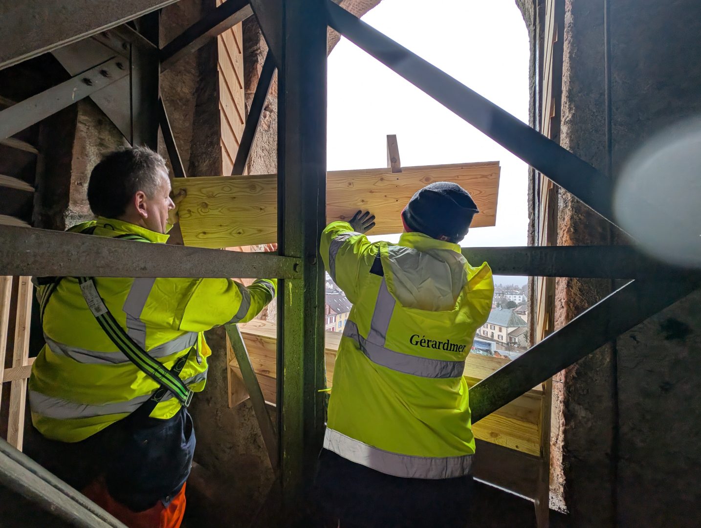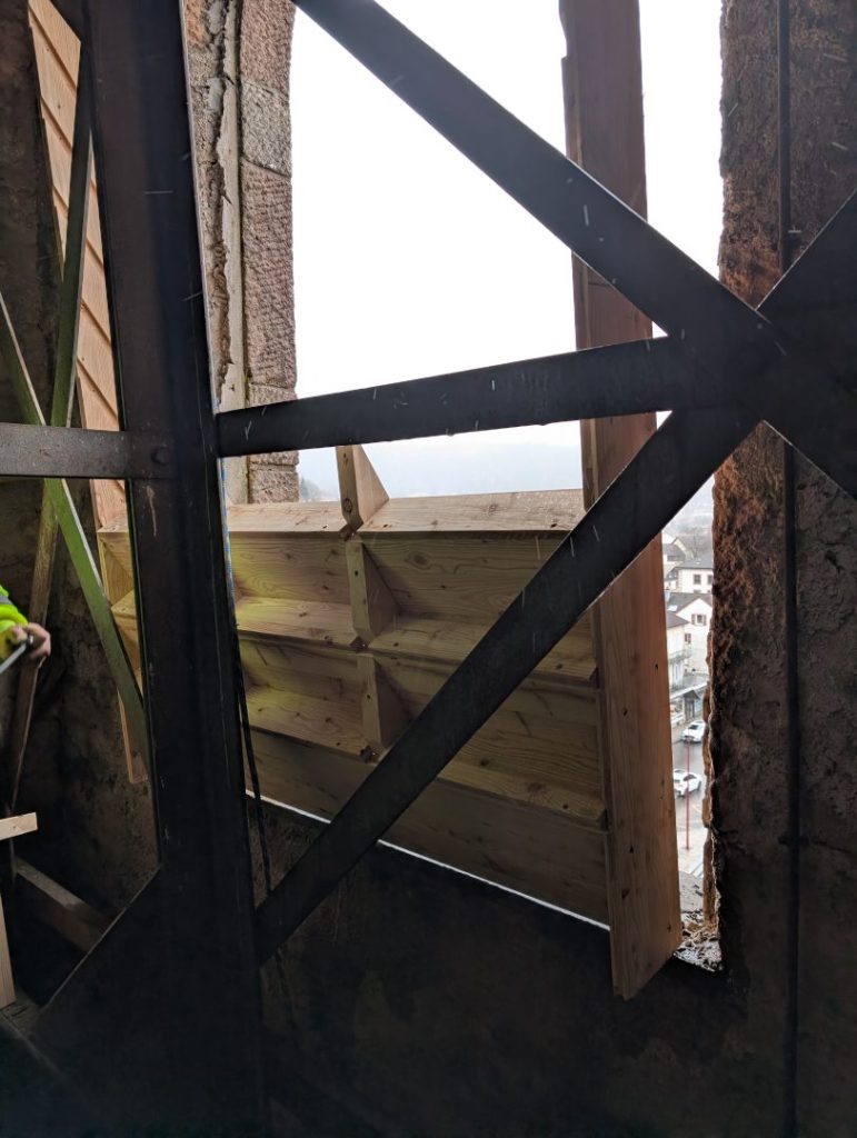 Les Services Techniques Municipaux, et plus particulièrement le Service Menuiserie, réalisent actuellement des travaux de remplacement des abat-sons de l’église, rendus nécessaires en raison de leur forte dégradation. Cette intervention concerne les deux grandes fenêtres du clocher, côté place du Vieux Gérardmé, chacune équipée de 13 abat-sons. Les abat-sons jouent un rôle essentiel : ils permettent une bonne diffusion du son des cloches tout en protégeant le clocher contre les intempéries, l’humidité et les intrusions d’oiseaux, contribuant ainsi à la préservation de l’édifice.