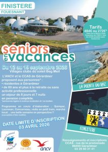 L’ANCV et le CCAS de Gérardmer proposent aux seniors gérômois un séjour convivial de 8 jours / 7 nuits en pension complète, du 12 au 19 septembre 2026, aux Villages Clubs du Soleil – Beg Meil.