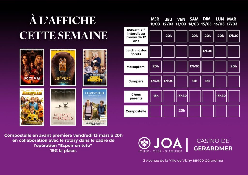 Une avant-première du film Compostelle aura lieu le vendredi 13 mars à 20h, en collaboration avec le rotary dans le cadre de l’opération « espoir en tête ».