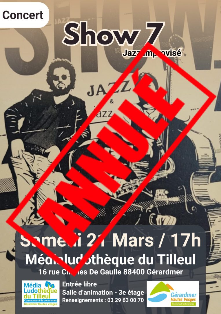 La Médialudothèque informe que le concert du groupe Show 7, initialement prévu le samedi 21 mars, est annulé.