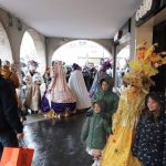 Replis sous les arcades, visite de l’exposition au centre culturel Zaug, abri sous un porche, pause-café au chaud, tout et tous s’adaptent, sans compter évidemment les parapluies qui eux aussi défilent et protègent costumes et costumés.