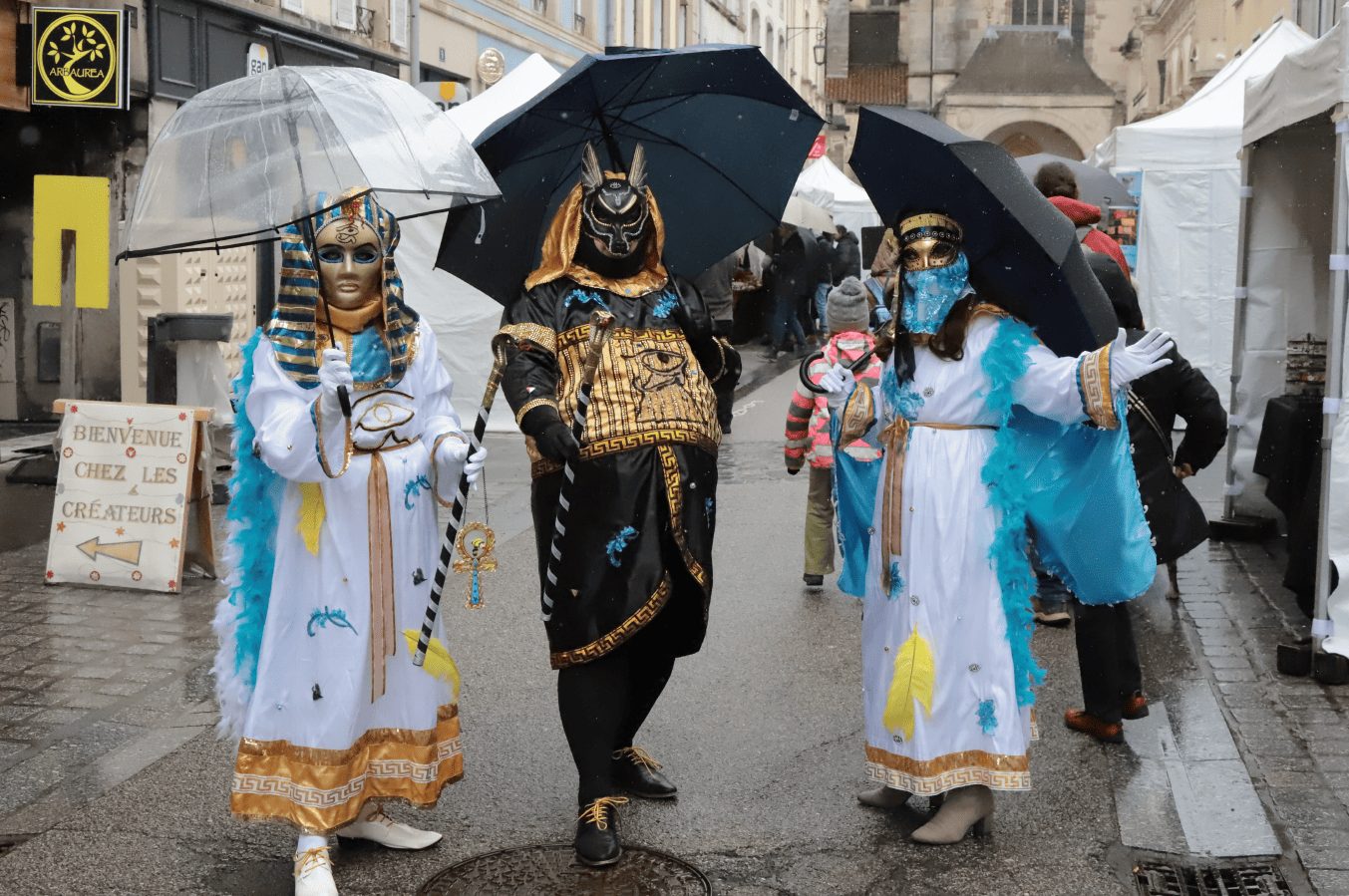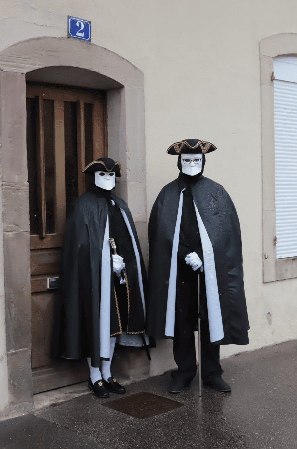 Replis sous les arcades, visite de l’exposition au centre culturel Zaug, abri sous un porche, pause-café au chaud, tout et tous s’adaptent, sans compter évidemment les parapluies qui eux aussi défilent et protègent costumes et costumés.