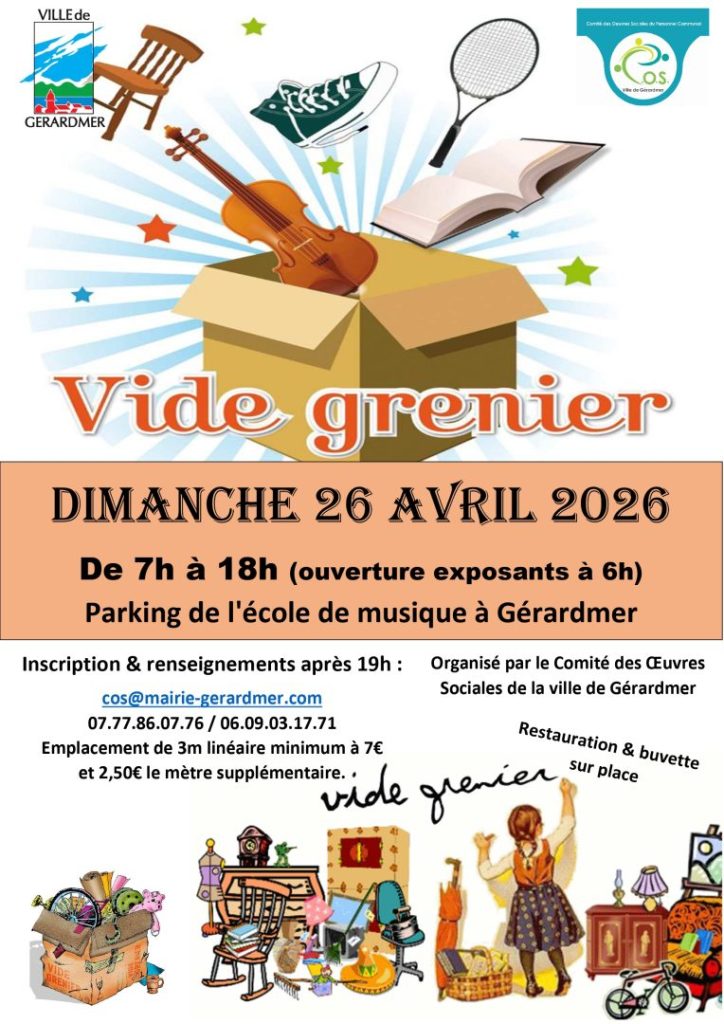 Le C.O.S. de la ville de Gérardmer organise un vide grenier le 26 avril 2026 sur les parkings autour de l’école de musique.